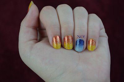 The 4th prompt of the 15 Nails of Summer is weather! I live in a high dessert, which basically means it is too hot to do anything or there is a horrible thunderstorm outside and you can barely leave your house anyway. So, I wanted to show this through nail art. I thought that the best way to do this was by a gradient. I decide to do a glitter red and yellow gradient on four of my fingers and, since it just starts pouring down rain out of no where here, I did a rainy gradient on my ring finger. To add the effect of too much heat, I added a gold glitter on the yellow/red gradient and then a silver-ish glitter to the rain gradient.